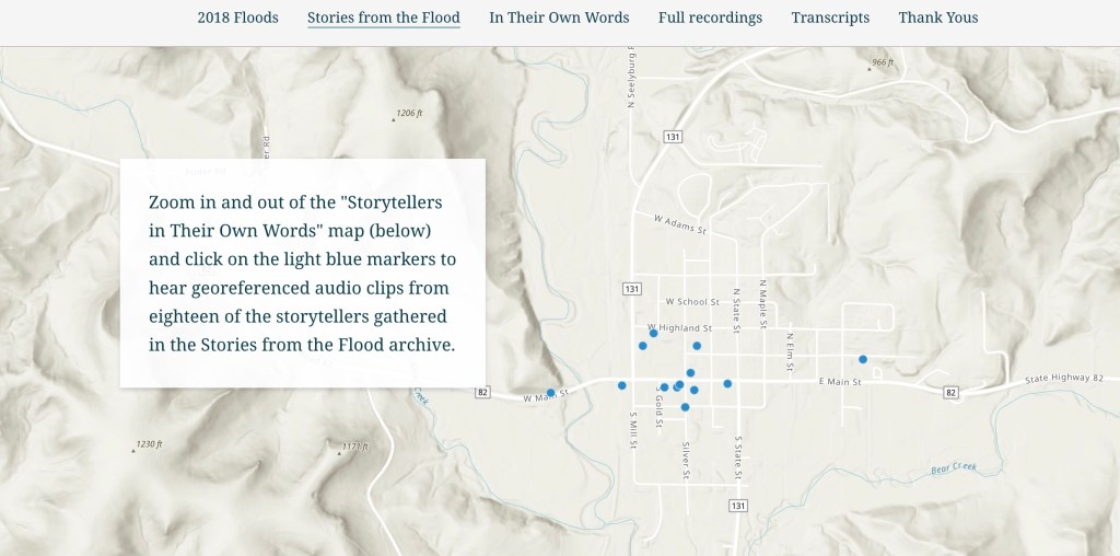 Viroqua, Wisconsin’s Driftless Writing Center created the Stories from the Flood project in early 2019, in response to catastrophic flooding in southwestern Wisconsin in August and September 2018. With the support of students from UW-Madison and UW-La Crosse, the project has gathered over 100 community stories of flooding in hopes of supporting community healing and serving as a resource for future conversations about flood recovery and resilience. The stories are shared publicly through the Oral History Program at UW-La Crosse, and have been featured in a an interactive StoryMap, a pair of podcasts (Wisconsin Humanities, Edge Effects) and several articles, including “Storying the Floods: Experiments in Feminist Flood Futures.“